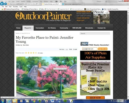 July 2014: It was a wonderful honor that Jennifer and her plein air paintings were featured in Plein Air Magazine's EZine OutdoorPainter.com! Thank you PleinAir Magazine!